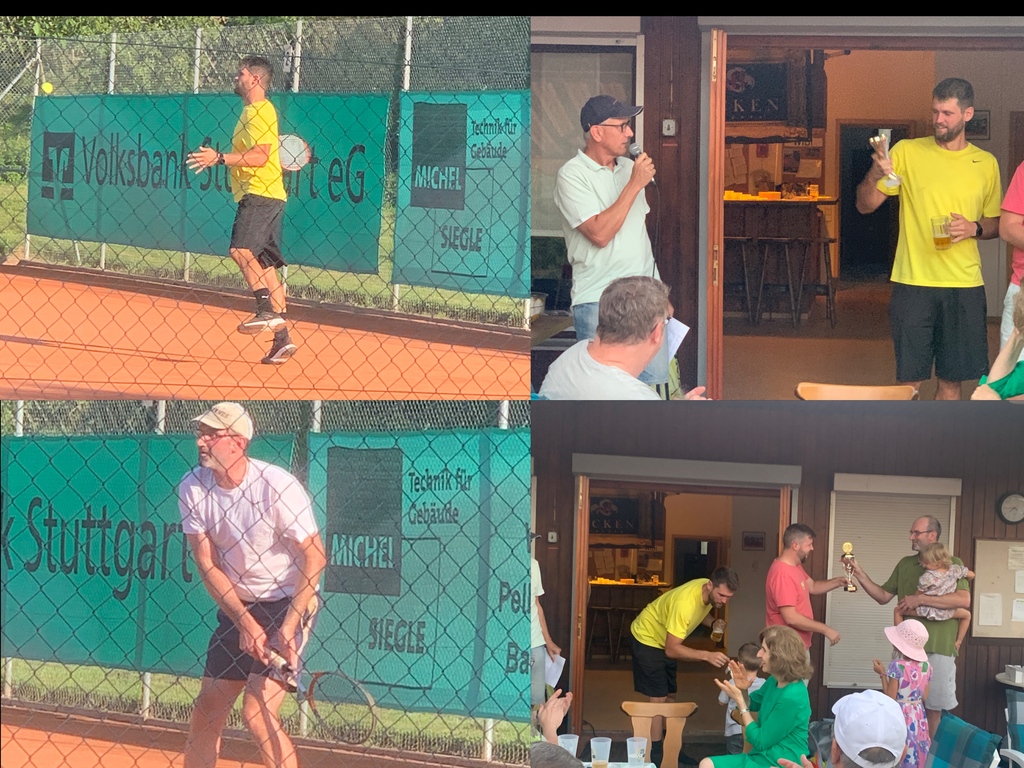 Am späten Nachmittag duellierten sich Philmon Kollas (links oben) und Johannes Stock (links unten) auf unserem „Center Court“ – Phil bekam bei der anschließenden Siegerehrung den Pokal des Zweitplatzierten überreicht von Jörg Klein (1. Vorsitzendem).